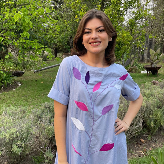 Vestido Lino Manga Plisada Bordado Cuernavaca