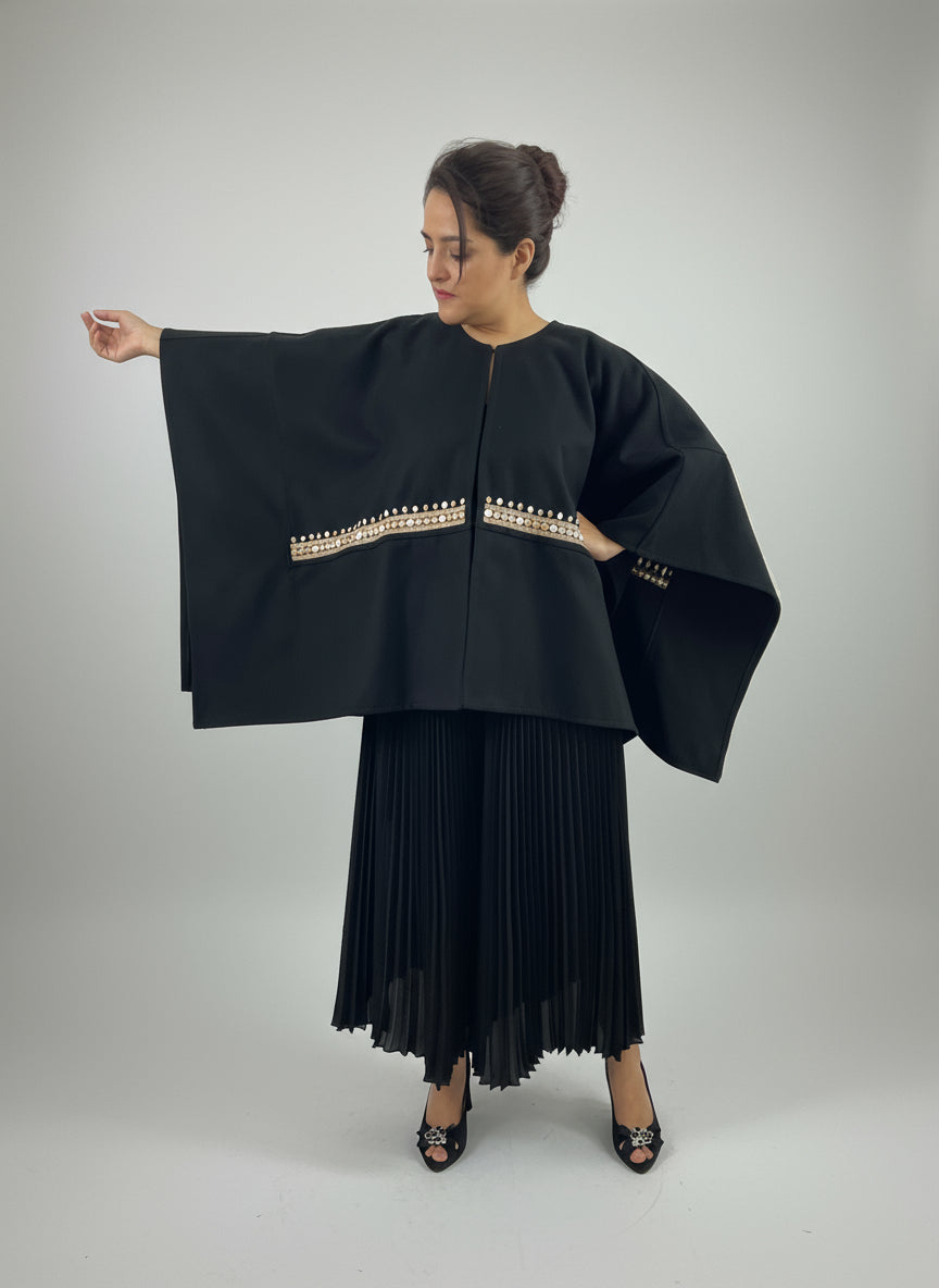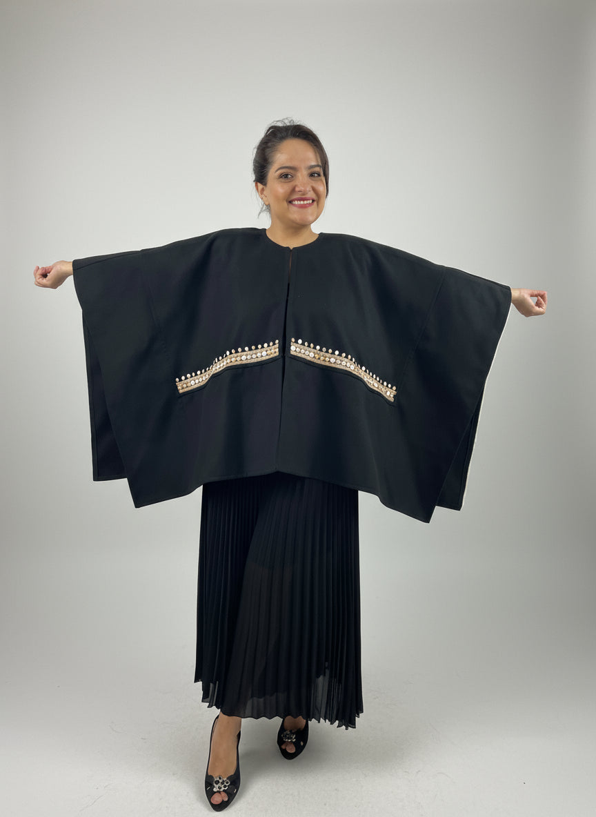 Capa confeccionada en grueso paño de lana, de corte rectangular, bordada a mano con fino hilo vela mercerizado con motivos originales de Chamula. Bordada en colores rojo, mostaza y oro y Blanco, gris y beige.