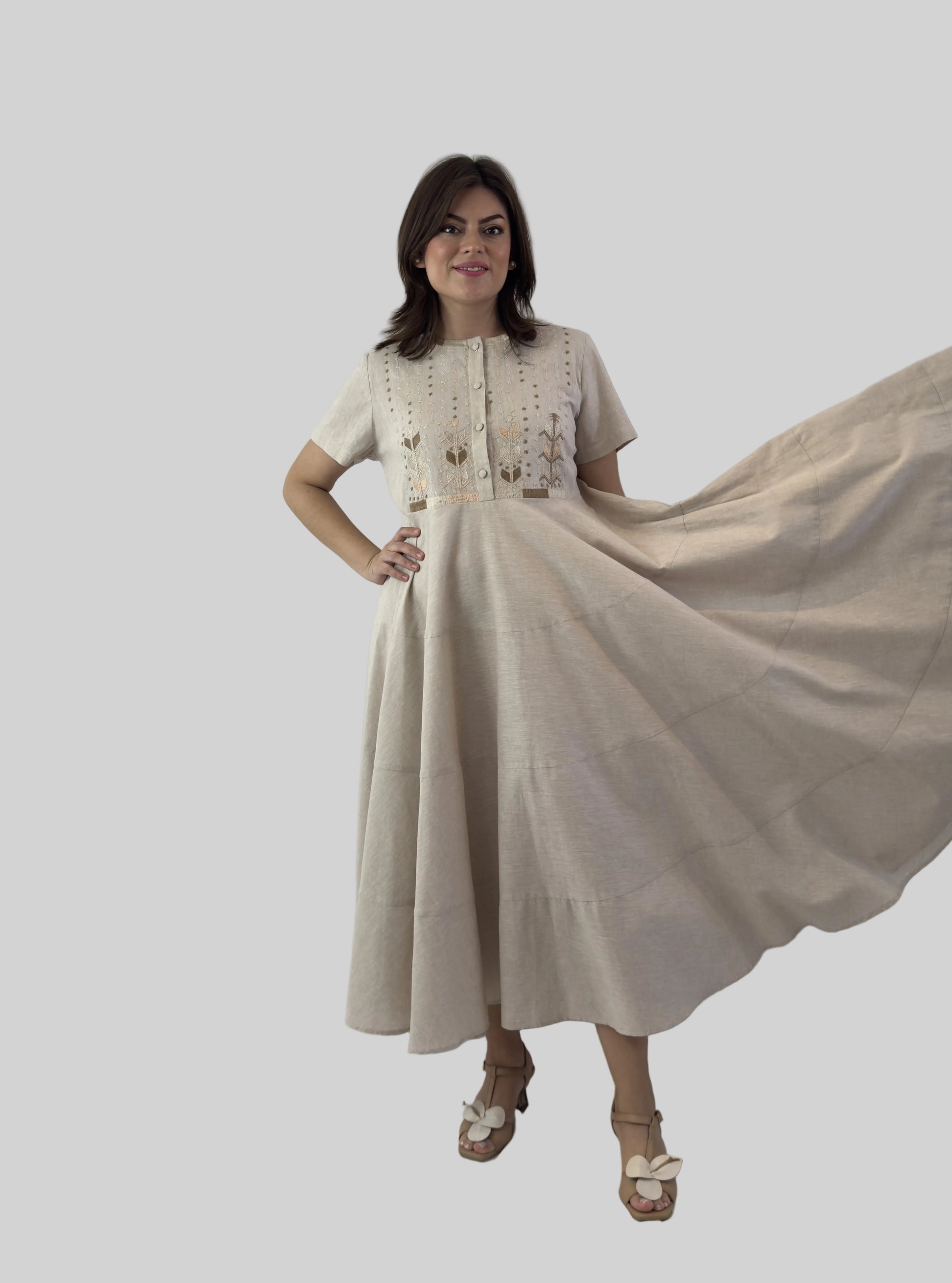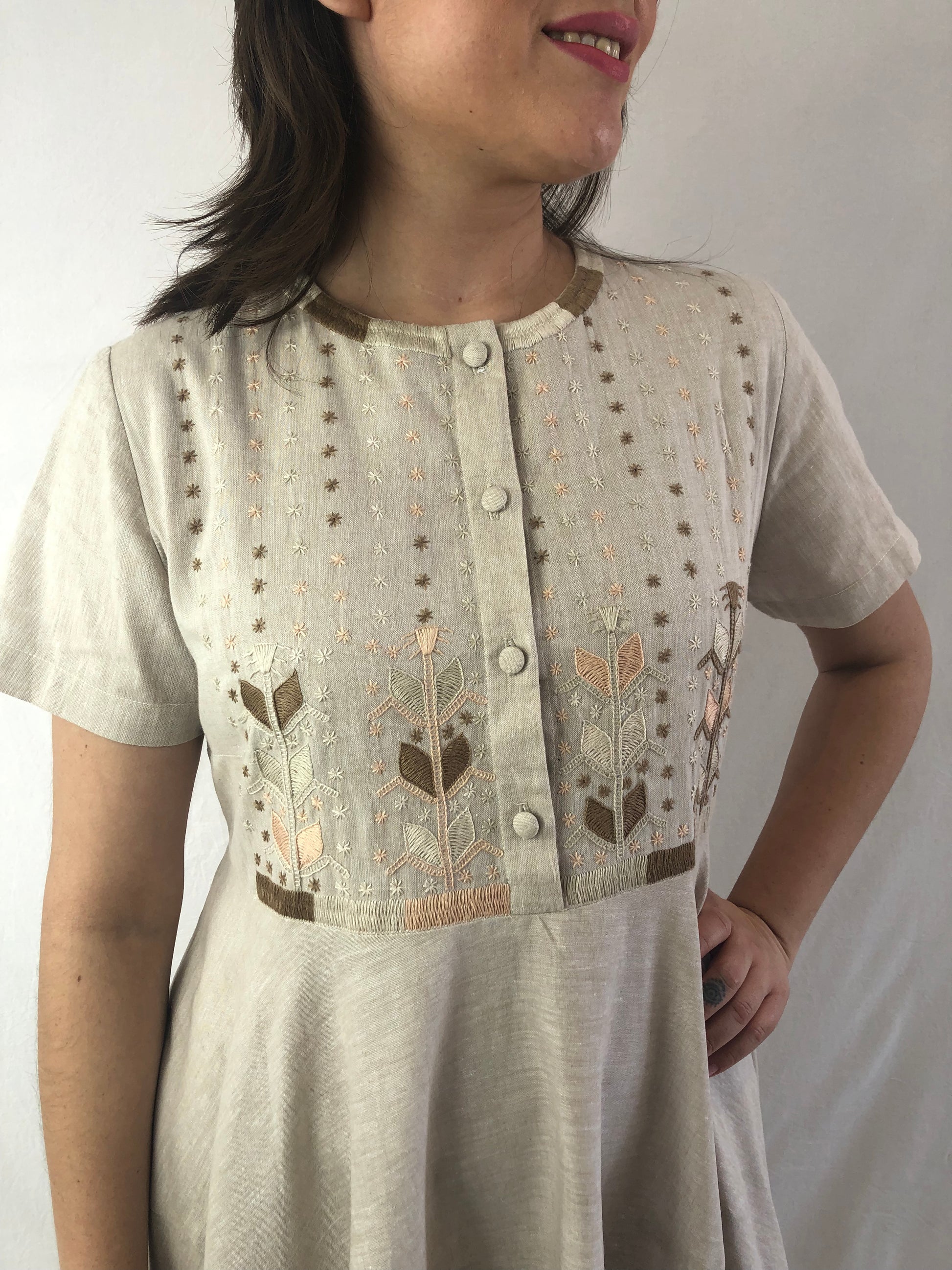 Vestido en lino-algodón falda circular con tres cortes, bordada a mano modelo Milpa de Chamula